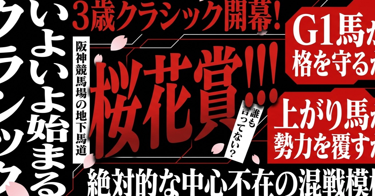 いよいよ始まるクラシック!今度生まれてくる時も、桜花咲く阪神競馬場の地下馬道で会おうぜ、と誰が言ったか知らないが!え、誰も言ってない?何はともあれ、3歳クラシックも今日開幕!G1馬が格を守るか、トライアルで力を付けた上がり馬が勢力を覆すか、絶対的な中心不在の混戦模様、桜花賞!!!