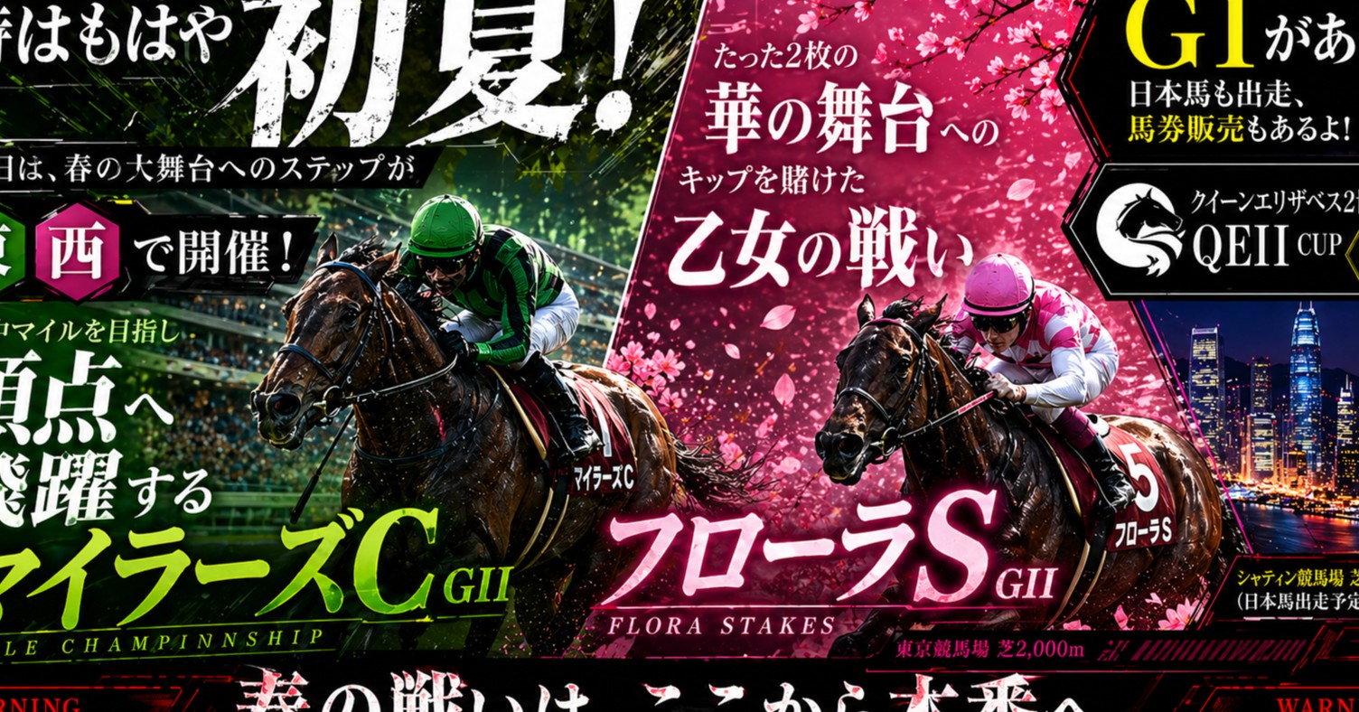 すっかり暖かくなり時はもはや初夏!本日は、春の大舞台へのステップが東西で開催!府中マイルを目指し頂点へ飛躍するマイラーズCと、たった2枚の華の舞台へのキップを賭けた乙女の戦い、フローラS!!!なお香港ではG1があり、日本馬も出走、馬券販売もあるよ!